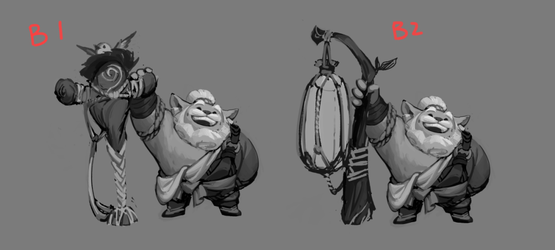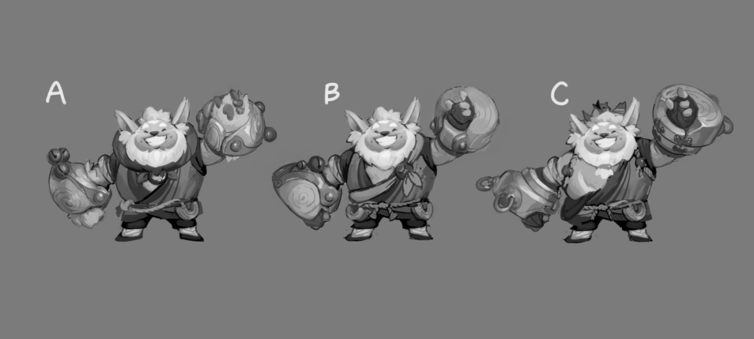 我们知道可酷伯要像其他约德尔人英雄一样矮小,但他是个坦克,所以肯定也很壮实。其实我们想把他做成一个大块头,但他毕竟是约德尔人,所以最终我们决定让他做一个1米2的巨汉。我想过给他穿上盔甲,展现强壮的硬汉形象,但他的力量来自内心,这样做未必合适。