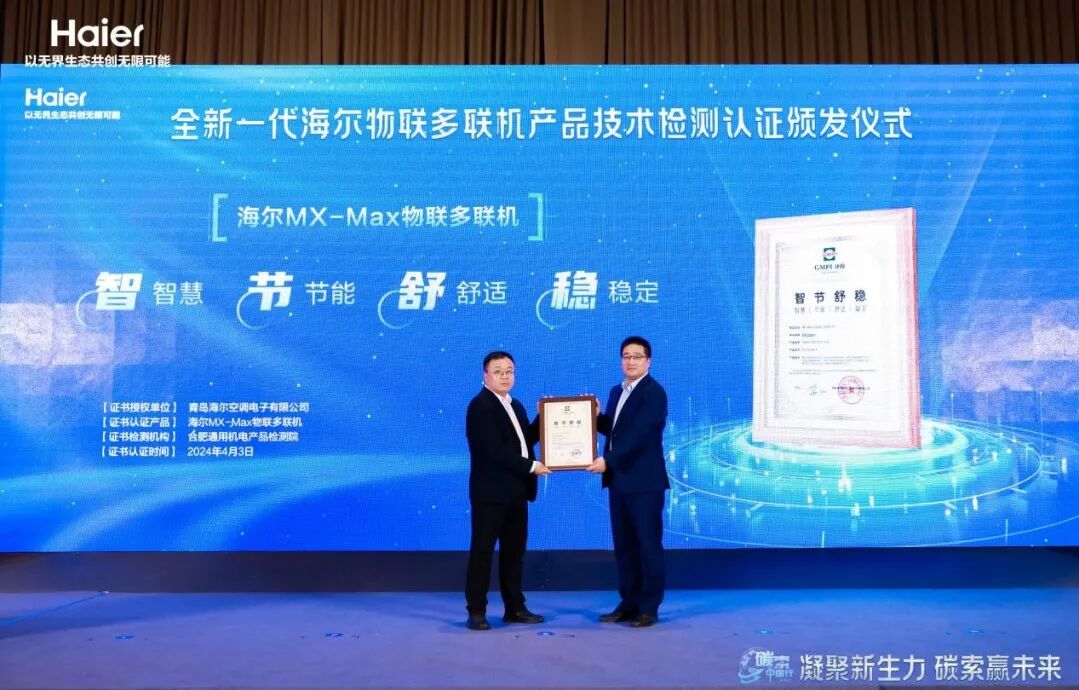合肥通用机电产品检测院制冷所所长谢鸿玺进行第三方多联机认证解读,颁发新一代物联多联机产品技术认证证书。海尔物联多联机在技术研发上又拔头筹。