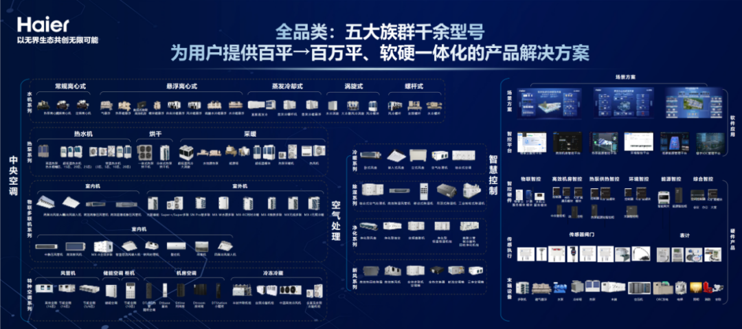 会议现场,海尔智慧楼宇展示了包括物联多联机、磁气悬浮、热泵在内的全品类、五大族群、千余型号的产品矩阵。