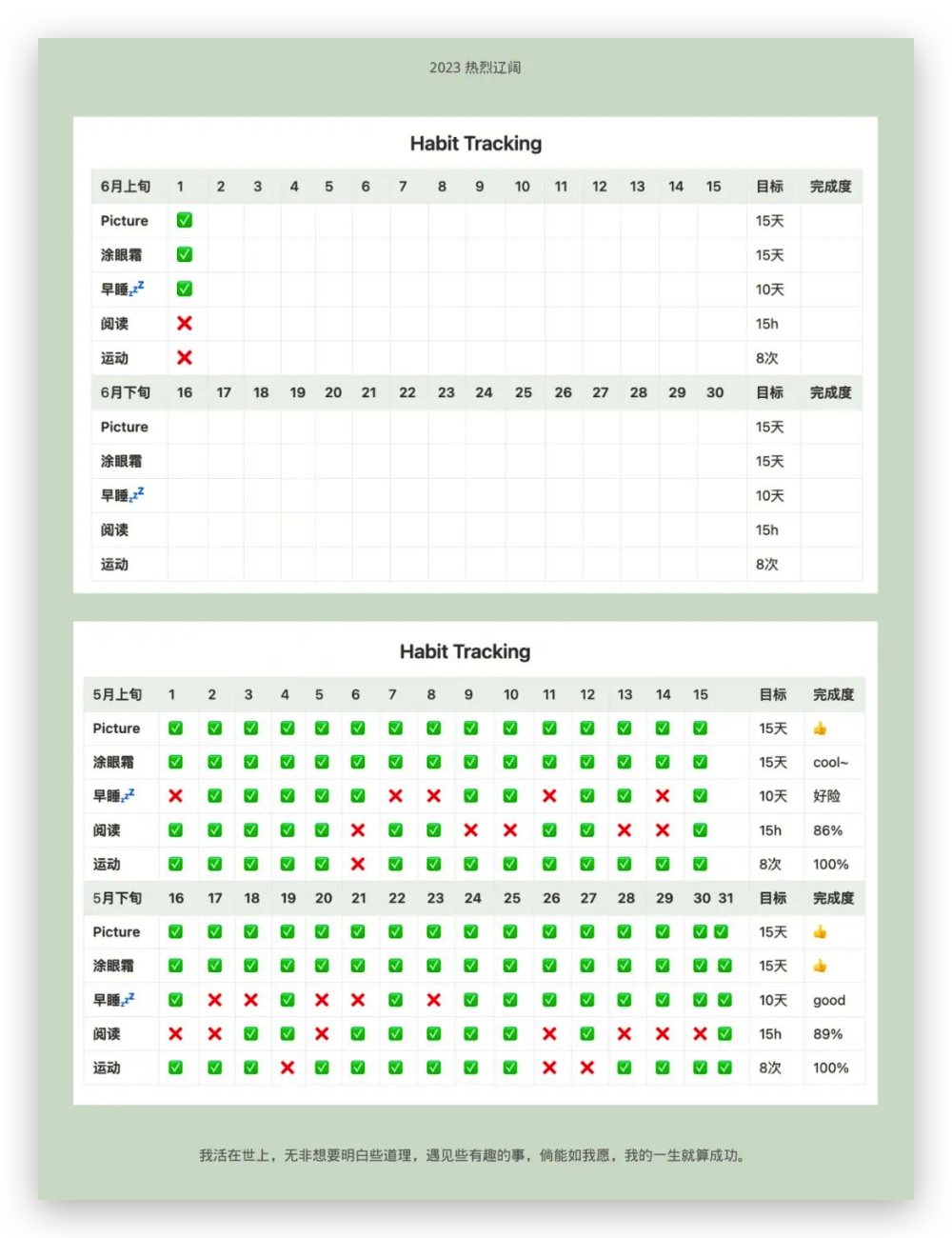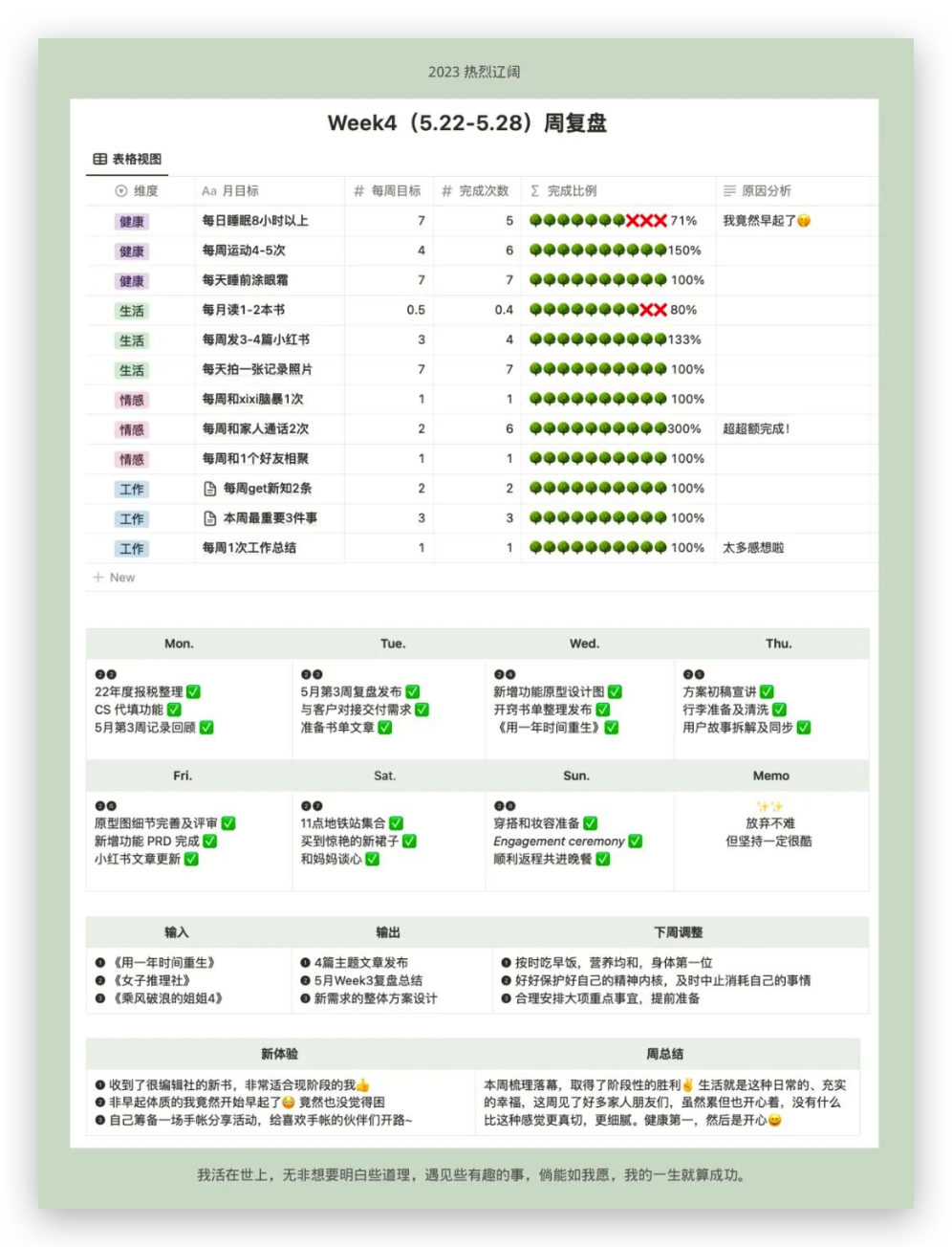 像设定游戏规则一样,每个月给自己两条命,半个月分析一次。如果上半个月效果不佳,可以在下半个月及时调整,要找到舒服的、可持续的方式才能长久。