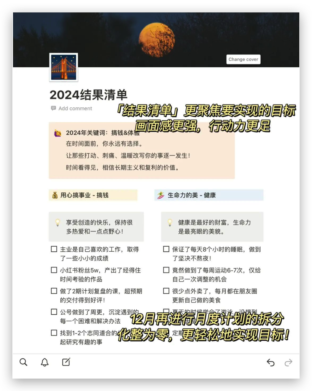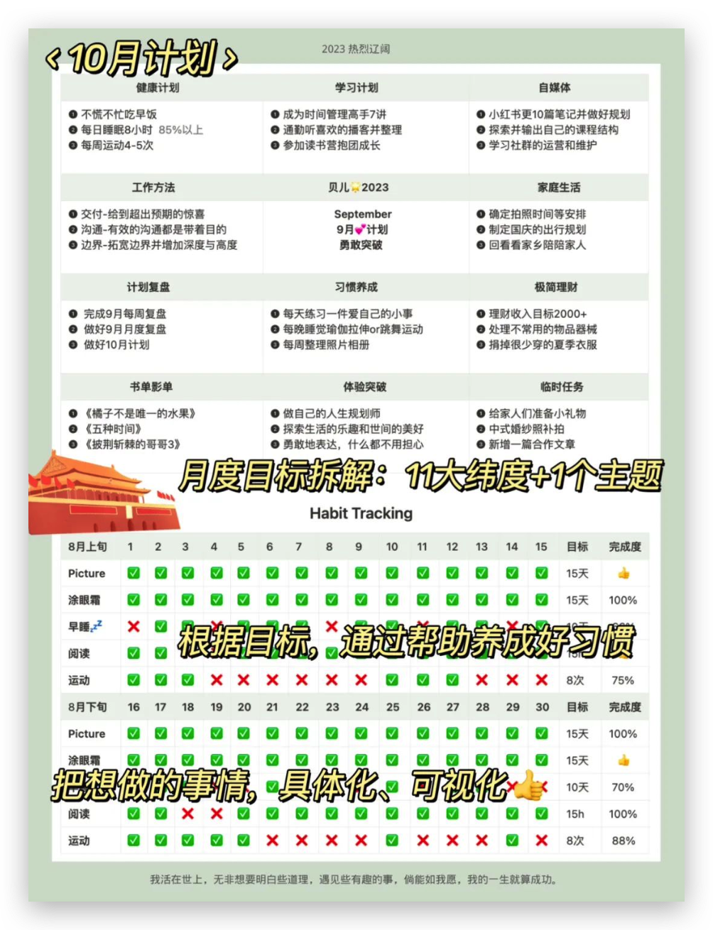 🌰比如,我通过年目标倒推,明确了月度计划,从而拆解量化到每周、每日的任务和待办清单。