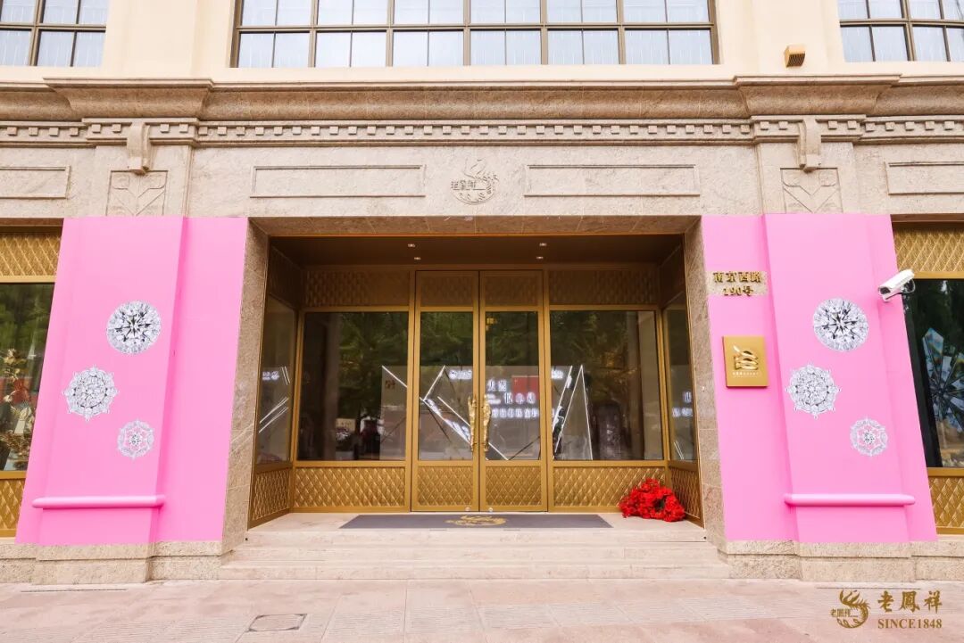为助力第五届上海 “五五购物节”和“上海之夏”国际消费季, 为期一月的“悦天然 悦心动—老凤祥钻石珠宝珍品展”于 4月26日在位于南京西路 190号的老凤祥珍品私洽中心闪耀启幕。本次珍品展汇集了百余件由老凤祥中国工艺美术大师们领衔设计的精品佳作与老凤祥历年收藏的极品珍藏钻石,以“璀璨天成” “极致匠心”“盛世典藏”三大篇章,运用交互光影技术,结合展示、科普、互动,让参观者得以沉浸式感受天然钻石的瑰丽珍稀与闪耀夺目:价值超亿元的顶级粉钻璀璨亮相、各种大克拉异型钻齐聚一堂,博物馆馆藏“金钻老爷车”惊艳亮现,更有张心一、张京羊、陆莲莲、宋菁、刘红宝、黄雯等中国工艺美术大师各时期的代表作齐齐亮相,礼赞天然钻石的非凡传奇和匠心杰作的不朽魅力。老凤祥珍品私洽中心大楼“佩戴”巨幅“悦动”钻石项链,令百年历史建筑与全新“悦动”系列浪漫互动,再度成为人民广场风貌区的打卡热点。