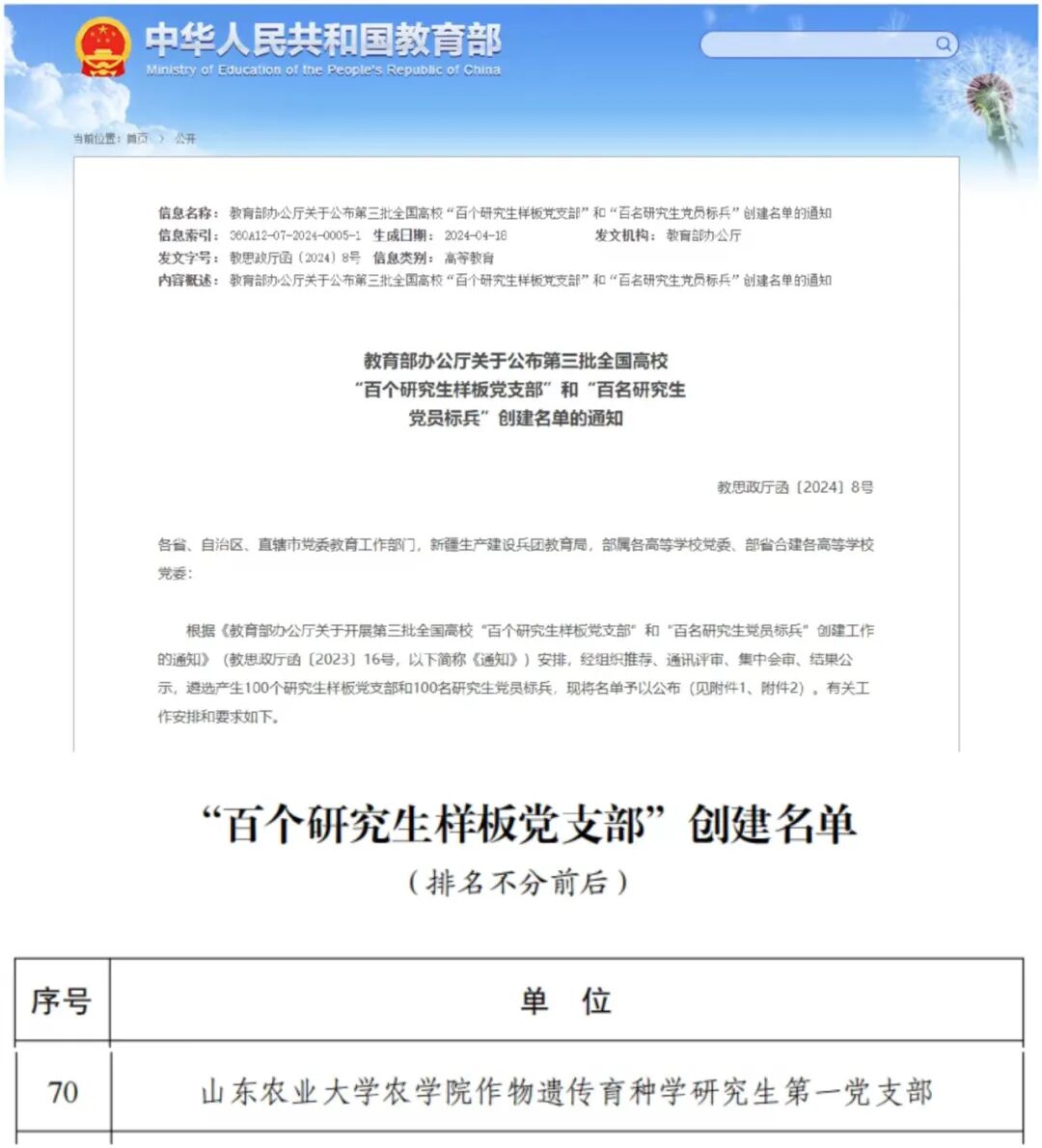 近日,教育部公布第三批全国高校“百个研究生样板党支部”和“百名研究生党员标兵”创建名单,我校农学院作物遗传育种学研究生第一党支部成功入选第三批全国高校“百个研究生样板党支部”创建名单,实现研究生党建新突破。