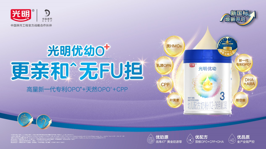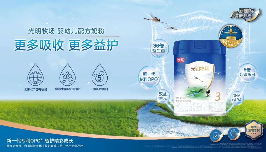 新国标光明牧场、光明致优和光明优幼三款婴配粉系列产品在既往的配方基础上做了非常大的提升,全系列添加新一代专利OPO*,以黄金标准的营养配比,给宝宝带来更亲和的体验;奶源均来自于北纬47°黄金奶源带——黑龙江松嫩平原光明自有科技牧场。并且,光明乳业旗下牧场均采用了独创的“千分牧场”标准评价体系,并通过数字化手段精细管理,从源头确保原奶质量的产出。