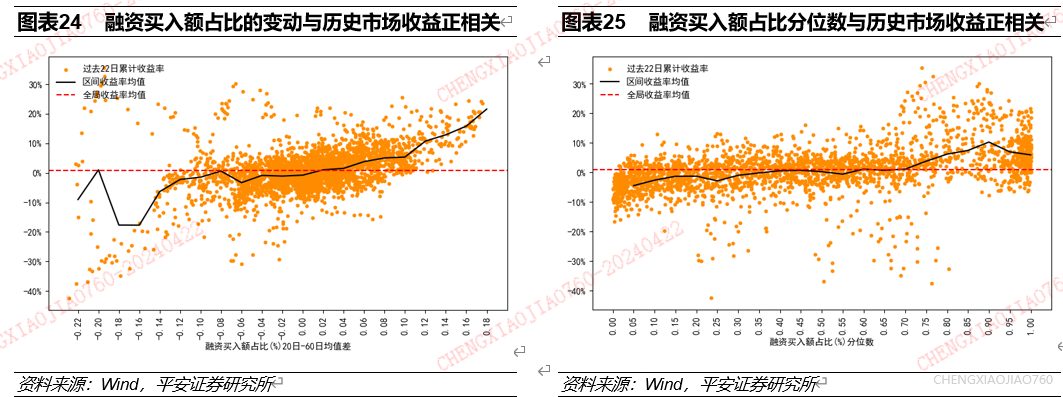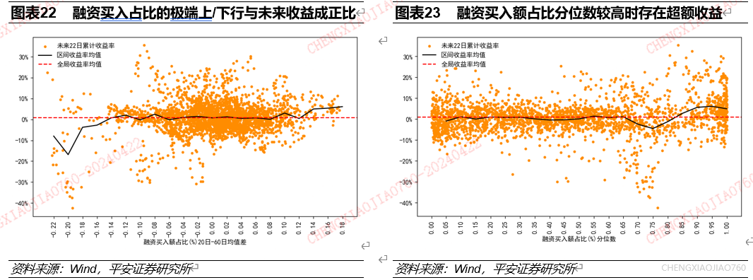 融资买入额占比的极端变动和大小都是资产择时的有效指标:融资买入额占比的极端上行/下行对应未来一个月资产收益水平的提升/下降,融资买入额占比较高时未来一个月市场超额收益显著;融资买入额占比的大小和变动都是资产表现的同步指标。根据长短期均线法统计发现:融资买入额占比近3个月上行幅度超过0.14%时,万得全A在未来一个月累计收益水平大幅提升;融资买入额占比近3个月下行幅度超过0.14%时,万得全A在未来一个月累计收益水平有大幅下滑;融资买入额占比的变动与过去一个月市场累计收益率正相关。根据历史分位数法统计发现,融资买入额占比分位高于0.85时,未来一个月市场存在显著超额收益,融资买入额占比的大小与资产过去一个月累计收益率正相关。
