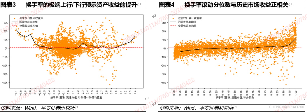换手率的极端变动是资产择时的有效指标:换手率的极端上行/下行对应未来一个月资产收益水平的提升;换手率的大小是资产表现的同步指标。根据长短期均线法统计发现,换手率近6个月上行幅度超过1%、下行幅度超过0.5%时,万得全A在未来一个月累计收益水平大幅提升。根据历史分位数法统计发现,换手率大小与资产过去一个月累计收益率正相关,即换手率大小是市场收益表现的同步指标。