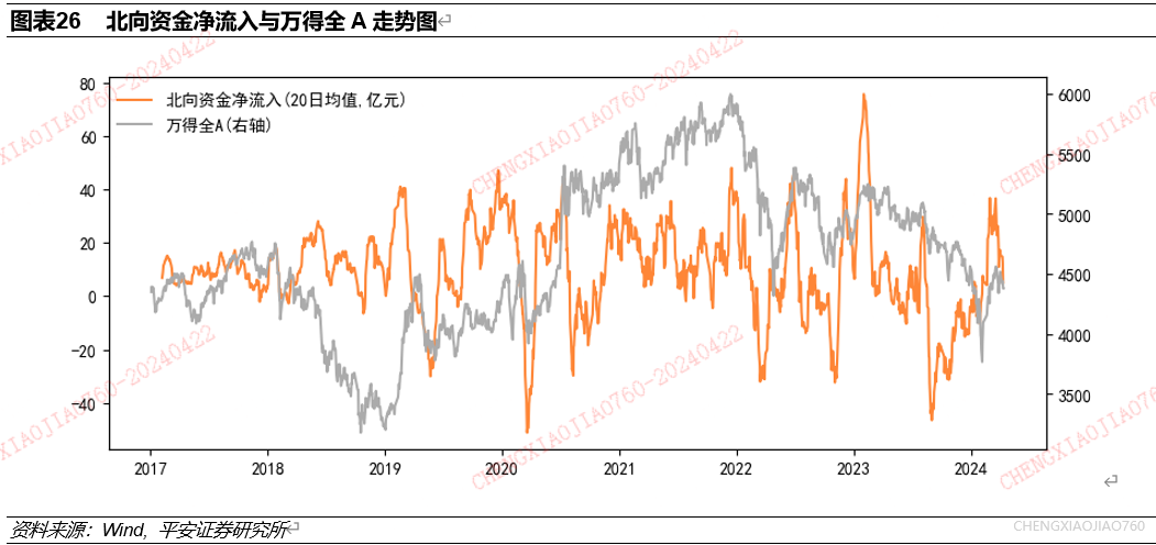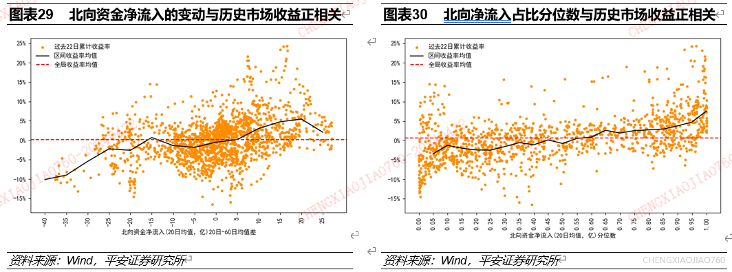 北向资金反映了外资对A股的偏好,在市场上行阶段,北向资金净流入有增加的趋势,北向资金净流入的触底反弹是市场底部的领先信号。使用2017年以来数据,统计北向资金净流入的20日均值与万得全A收益表现的关系。可以看到,北向资金净流入与市场行情趋势较为一致,但北向资金净流入触底反弹常领先于市场底部,北向资金净流入的阶段性变动周期小于市场行情的牛熊周期。