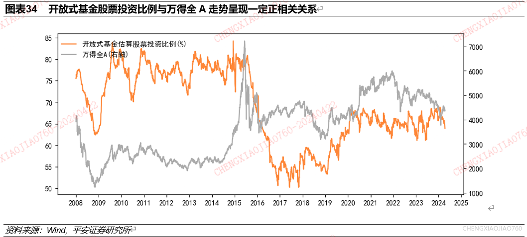开放式基金股票投资比例反映了开放式基金整体对A股的偏好,与万得全A走势呈现一定正相关关系。开放式基金股票投资比例估算了全部开放式基金(截至2024年4月15日共8557只)的整体股票投资比例,反映了基金经理整体对股票的偏好。使用2008年以来数据,统计开放式基金股票投资比例与万得全A收益表现的关系。可以看到,开放式基金股票投资比例有跟随市场行情变动的趋势,在一些市场拐点附近,该投资比例的变动有一定信号价值。