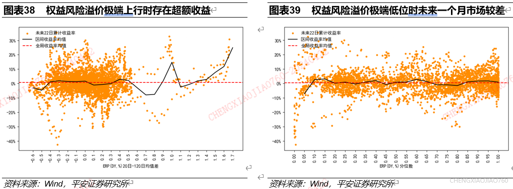 基于股息率计算的权益风险溢价的极端变动和极端位置都是资产择时的有效指标:权益风险溢价极端上行对应未来一个月资产收益水平的提升,权益风险溢价极端低位对应未来一个月资产收益水平的下降。根据长短期均线法统计发现:近6个月基于股息率计算的权益风险溢价极端上行时,未来一个月万得全A存在显著超额收益。根据历史分位数法统计发现,权益风险溢价极端低位时,未来一个月市场表现较差。