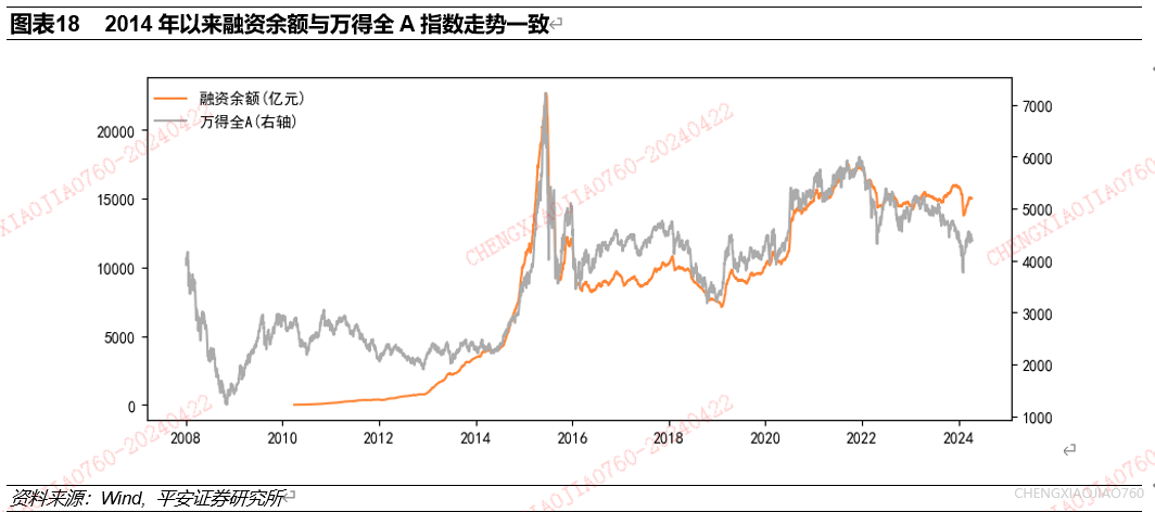 融资余额通过杠杆资金存量反映了投资者的信心水平,2014年起融资余额与万得全A指数走势基本保持一致。使用2010年4月以来数据,研究A股市场融资余额与万得全A收益表现的关系。融资余额是指市场中融资买入未偿还的金额,融资资金作为买入股票的杠杆性资金,其水平反映了投资者的信心水平。可以看到,融资余额与万得全A指数走势基本保持一致,两者走势在出现背离后倾向于有收敛趋势。