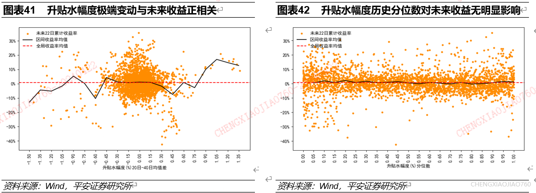 股指期货升贴水幅度的极端变动是资产择时的有效指标:股指期货升贴水幅度的极端上行/下行对应未来一个月资产收益水平的提升/下降。根据长短期均线法统计发现:沪深300股指期货升贴水幅度大幅上行时,未来一个月万得全A存在显著超额收益。沪深300股指期货升贴水幅度大幅下行时,未来一个月万得全A收益表现较差。