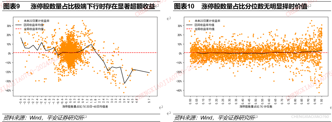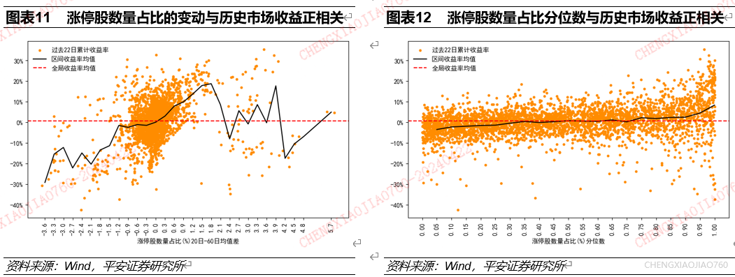 涨停股数量占比的极端变动是资产择时的有效指标:涨停股数量占比的极端下行/上行对应未来一个月资产收益水平的提升/下降;涨停股数量占比的大小和变动都是资产表现的同步指标。根据长短期均线法统计发现:涨停股数量占比近3个月下行幅度超过1%时,万得全A在未来一个月累计收益水平大幅提升;涨停股数量占比近3个月上行幅度超过2%时,万得全A在未来一个月累计收益水平有大幅下滑;涨停股数量占比的变动与过去一个月市场累计收益率正相关。根据历史分位数法统计发现,涨停股数量占比的大小与资产过去一个月累计收益率正相关。