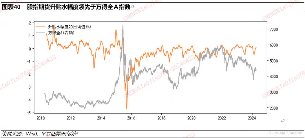 股指期货升贴水幅度领先于市场走势。沪深300股指期货升贴水幅度衡量了沪深300指数期货价格相对于现货的溢价幅度,体现了期货市场投资者对未来市场走向的预期,计算方法为沪深300指数期货活跃合约收盘价/沪深300-1。升贴水幅度的大幅上升意味着投资者对市场未来走势较为乐观,大幅下滑则意味着对市场未来的悲观态度。使用2010年4月以来数据,统计股指期货升贴水幅度与万得全A的关系,可以看到股指期货升贴水幅度的走势常领先于市场。