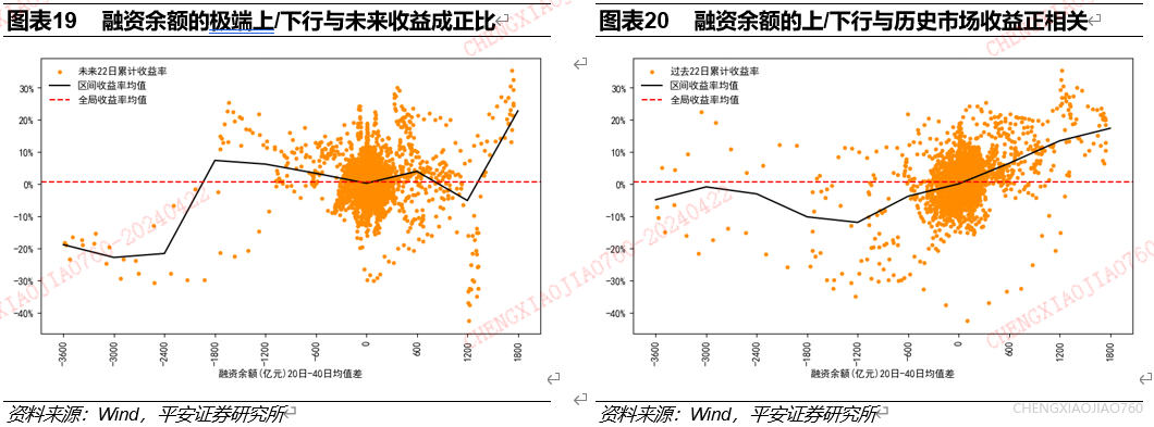 融资余额的极端变动是资产择时的有效指标:融资余额的极端上行/下行对应未来一个月资产收益水平的提升/下降;融资余额的变动是资产表现的同步指标。根据长短期均线法统计发现:融资余额近2个上行幅度超过1500亿元时,万得全A在未来一个月累计收益水平大幅提升;融资余额近2个月下行幅度超过2000亿元时,万得全A在未来一个月累计收益水平有大幅下滑;融资余额的变动与过去一个月市场累计收益率正相关。