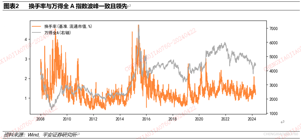 换手率是市场行情中量的代理指标,与行情走势波峰一致且领先,2010年以来换手率对市场表现领先性减弱。使用2008年以来数据,研究万得全A换手率与收益表现的关系。从走势来看,2010年以前换手率领先于市场走势,2010-2015年换手率与市场走势较为同步,2016年以来换手率的极端上行往往也对应着一波市场行情的开始。