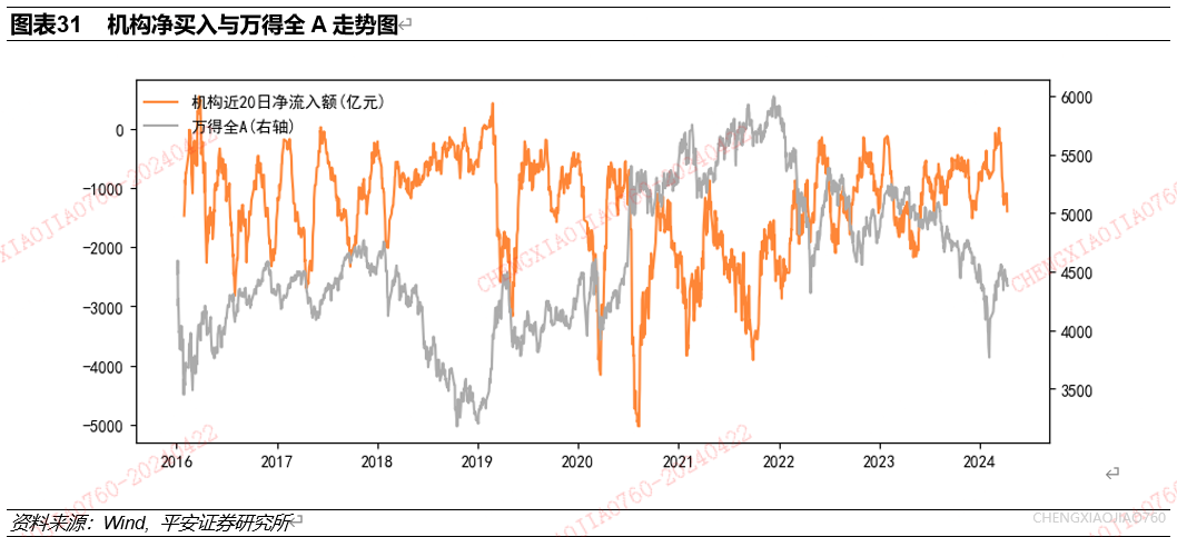机构净买入反映了机构投资者对A股的偏好,机构净买入的中枢倾向于在市场下行阶段逐渐抬升,在市场上行阶段逐步下降。机构净买入将当日所有挂单额大于100万元的超大单定义为机构买卖,统计了万得全A当日未停牌的所有成分股的买入金额与卖出金额之差。使用2016年以来数据,统计机构近20日净流入额与万得全A收益表现的关系。可以看到,机构近20日净流入额的变动频率高于市场行情走势,但总体来看机构资金呈现市场上行阶段净买入中枢逐渐下降、市场下行阶段净买入中枢逐渐上升的趋势。