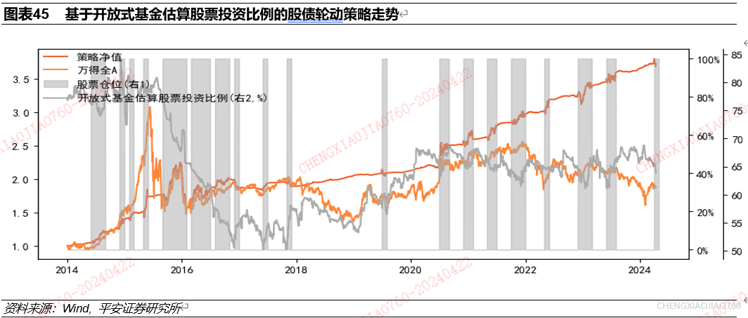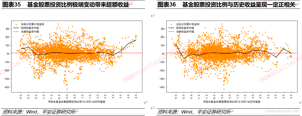 开放式基金股票投资比例的极端变动是资产择时的有效指标:开放式基金股票投资比例的极端上行/下行对应未来一个月资产收益水平的提升。开放式基金股票投资比例的变动是资产表现的同步指标。根据长短期均线法统计发现:近3个月开放式基金股票投资比例的极端上行/下行均对应未来一个月万得全A累计收益率的提升。近3个月开放式基金股票投资比例在-2.5%至2.5%区间范围内,与资产过去一个月累计收益率正相关,但投资比例的极端下行也常出现在近一个月市场平均收益高的情况下。