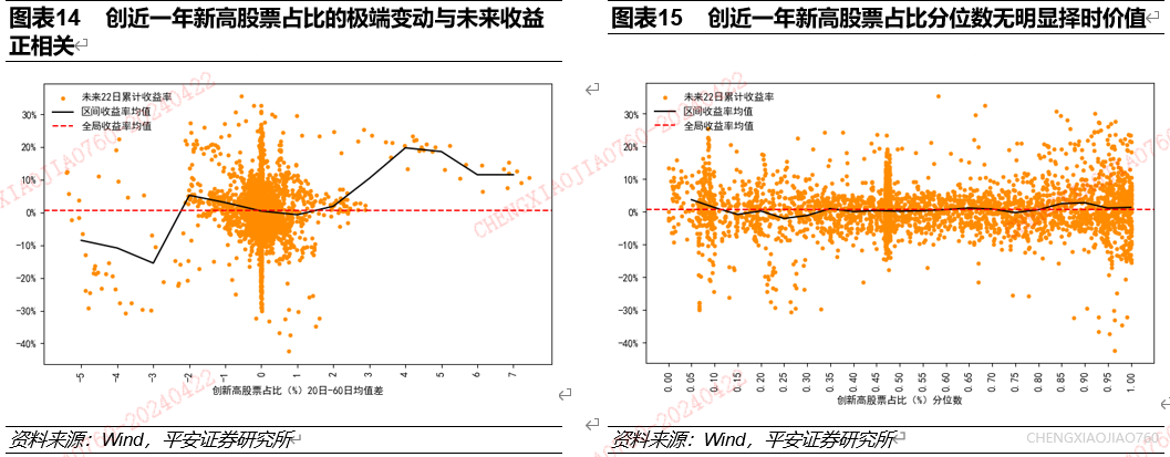 创近一年新高股票占比的极端变动是资产择时的有效指标:创近一年新高股票占比的极端上行/下行对应未来一个月资产收益水平的提升/下降;创近一年新高股票占比的大小和变动都是资产表现的同步指标。根据长短期均线法统计发现:创近一年新高股票占比近3个月上行幅度超过3%时,万得全A在未来一个月累计收益水平大幅提升;创近一年新高股票占比近3个月下行幅度超过2%时,万得全A在未来一个月累计收益水平有大幅下滑;创近一年新高股票占比的变动与过去一个月市场累计收益率正相关。根据历史分位数法统计发现,创近一年新高股票占比的大小与资产过去一个月累计收益率正相关。