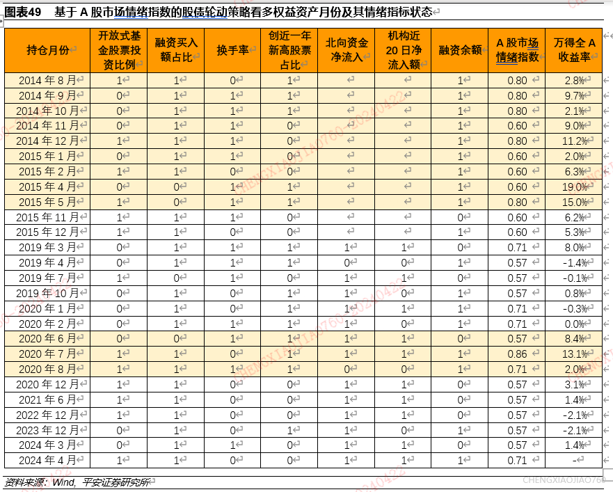 2014年以来,A股市场情绪指数的策略胜率高达75%。策略抓住了2014-2015年、2020年的两波大的上涨行情,在其余阶段平均表现也较为优异。在上述股债轮动策略中,月底A股市场情绪指数大于0.5时看多下月权益资产,策略胜率高达76%。在2014年以来共124个月中,发出看多权益市场信号的月份有26个,占比约21%。在2014-2015年换手率、融资买入额占比、融资余额、创近一年新高股票占比是看多权益市场的主要指标。在2020年,创近一年新高股票占比、北向资金净流入、融资买入额占比、融资余额是看多权益市场的主要指标。