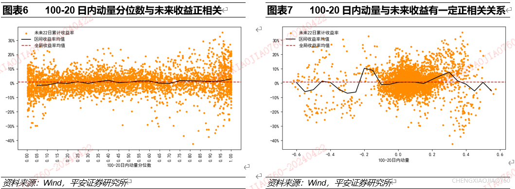 回望期100交易日、剔除期20交易日的日内动量因子大小是资产择时的有效指标,一般来说动量因子较大时未来一个月资产收益水平有所提升,但在数值极端大时动量因子有一定反转效应。根据历史分位数法统计发现,100-20日内动量分位数与未来一个月万得全A累计收益率存在一定正相关关系;从绝对数值大小来看,100-20日内动量数值在-0.1至0.3区间较为聚集,在该区间动量因子大小与未来累计收益率成正比,在100-20日内动量因子数值大于0.4时存在显著反转效应。