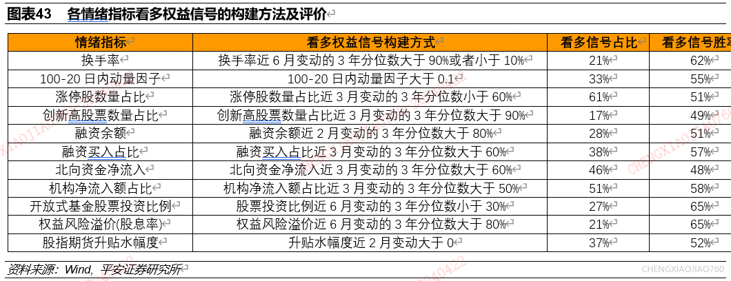 情绪指标有效性实证。情绪指标的大小、极端变动蕴含了丰富的市场择时信号,但不同情绪指标的信号模式存在较大差异。(1)换手率的极端上行/下行对应未来一个月资产收益水平的提升;(2)100-20日内动量因子较大时未来一个月资产收益水平有所提升,但因子数值极端大时动量因子有一定反转效应;(3)涨停股数量占比的极端下行/上行对应未来一个月资产收益水平的提升/下降;(4)创近一年新高股票占比的极端上行/下行对应未来一个月资产收益水平的提升/下降;(5)融资余额的极端上行/下行对应未来一个月资产收益水平的提升/下降;(6)融资买入额占比的极端上行/下行对应未来一个月资产收益水平的提升/下降,其数值较高时未来一个月市场超额收益显著;(7)北向资金净流入的大小和变动都和未来一个月市场平均收益正相关,但其极端下行时,市场表现也相对不错;(8)机构净买入的变动与未来一个月资产收益水平正相关,净买入的极端高位对应未来一个月资产收益水平的提升;(9)开放式基金股票投资比例的极端上行/下行均对应未来一个月资产收益水平的提升;(10)权益风险溢价极端上行对应未来一个月资产收益水平的提升,其极端低位对应未来一个月资产收益水平的下降;(11)股指期货升贴水幅度的极端上行/下行对应未来一个月资产收益水平的提升/下降。