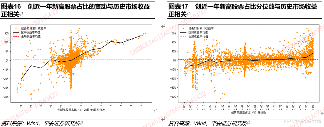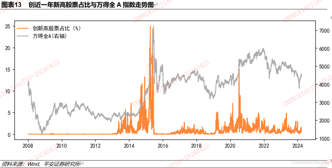 2013年以来,在市场上涨行情中创近一年新高股票占比往往会出现大幅提升,2015年创近一年新高股票占比领先于市场出现大幅回落。使用2008年以来数据,研究万得全A成分股中创近一年新高股票占比与指数收益表现的关系。创近一年新高股票占比为指数成分股中创250交易日新高的股票数量占比,该指标领先于2014-2015年牛市行情,并在市场下跌之前出现大幅下滑,对市场行情判断有一定信号价值。