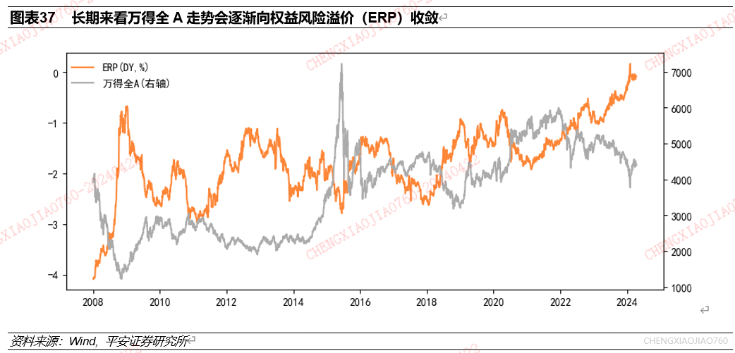权益风险溢价(ERP)反映了股债相对性价比,短期来看,ERP与万得全A走势相反;长期来看,由于ERP的均值回复特征,两者倾向于逐渐收敛。使用2008年以来数据,统计基于股息率的权益风险溢价(ERP)与万得全A的关系,权益风险溢价的计算方法为近12个月股息率减去10年国债到期收益率。从计算方法来看,ERP与市场行情走势相反。但从长期来看,由于ERP的均值回复特征,万得全A与ERP的背离倾向于逐渐收敛。
