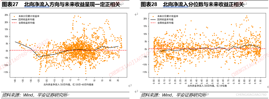 北向资金净流入的变动是资产择时的有效指标:一般来说北向资金净流入的大小和变动都和未来一个月市场平均收益正相关,但北向资金净流入极端下行时,市场表现也相对不错;北向资金净流入的大小和变动都是资产表现的同步指标。根据长短期均线法统计发现:在一般情况下,北向资金净流入变动与市场未来一个月累计收益率成正比;在北向资金净流入近3个月下行幅度超过25亿元时,北向净流入方向与未来收益成负相关,即在北向资金大幅流出时市场未来一个月有一定超额收益;北向资金净流入的变动与近期市场行情正相关。根据历史分位数法统计发现,北向净流入分位数与未来收益、历史收益率均呈现正相关关系。