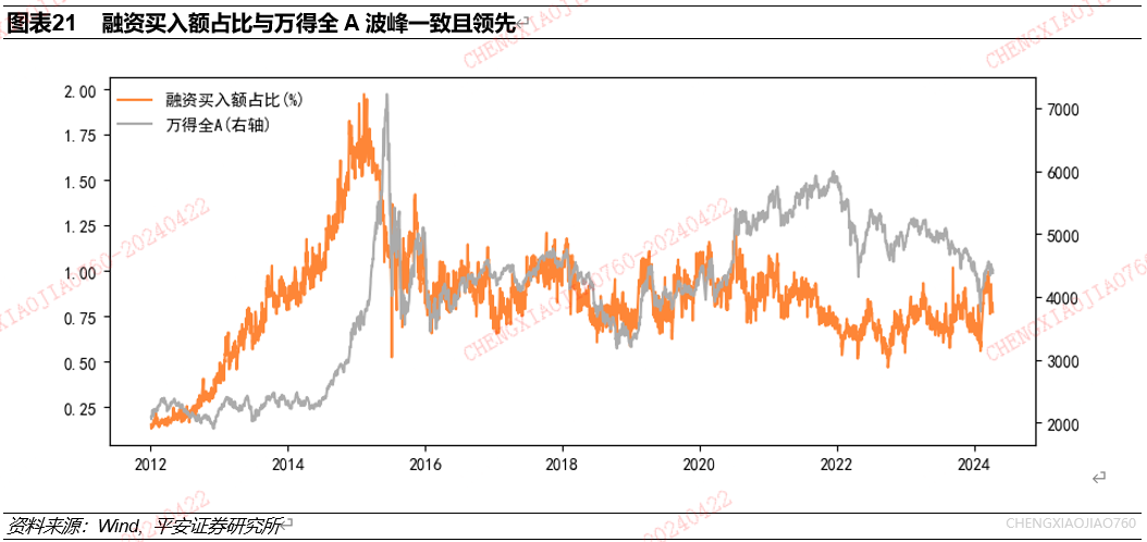 融资买入额占比反映了杠杆资金的交易倾向,对市场表现具有一定领先性,2021年以来这种领先性有所减弱。使用2012年以来数据,研究A股市场融资买入额占比与万得全A收益表现的关系。融资买入额占比指融资买入额占市场成交额的比重,反映了杠杆资金的交易倾向。可以看到,2012-2016年融资买入额占比领先于万得全A行情走势,2016-2021年两者走势较为同步,2021年以来两者相关性减弱。