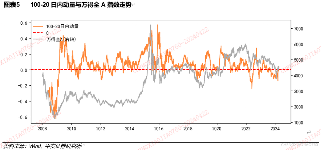 动量因子是市场行情中价的代理指标,与行情走势波峰一致且领先。在动量因子测试中,我们发现回望期100交易日、剔除期20交易日的日内动量对万得全A的择时效果较好。使用2008年以来数据,研究100-20日内动量与万得全A收益表现的关系。从走势来看,100-20日内动量数值集中在-0.2至0.4之间,与万得全A走势较为接近,日内动量因子小于0时万得全A表现较差。