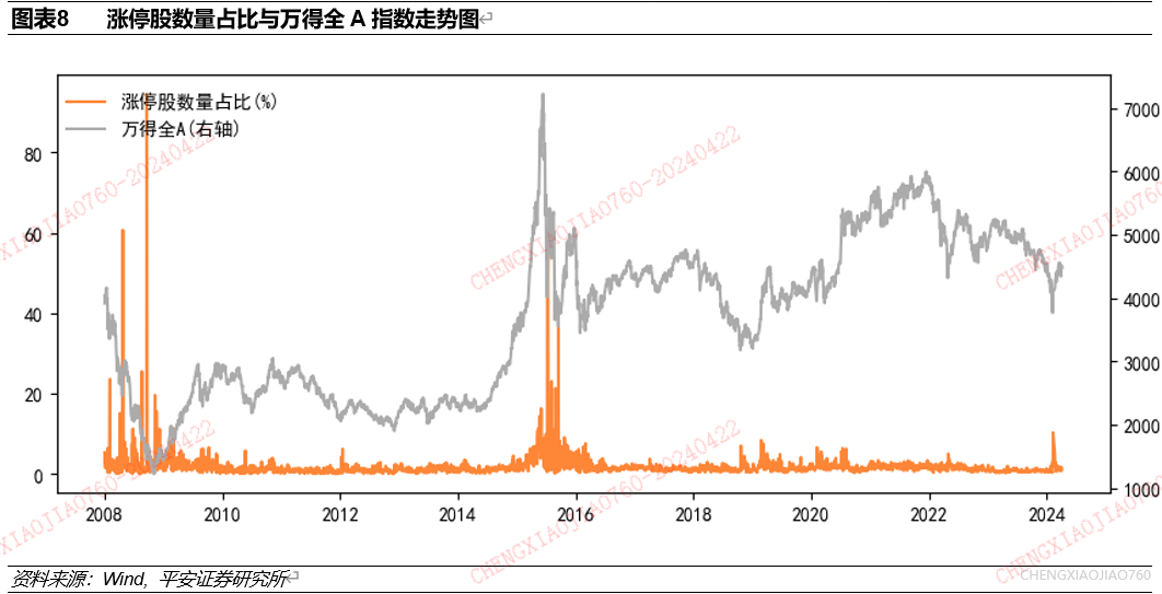 在上涨行情中,涨停股数量占比的大幅提高常出现在行情末期,需要关注市场过热风险。使用2008年以来数据,研究万得全A成分股中涨停股数量占比与指数收益表现的关系。涨停股数量占比为指数成分股中涨停股票数量占成分股数量的比重,可以看到在2008年、2015年涨停股数量占比的大幅提升都对应于上涨行情的末期。即在一波上涨行情中,涨停股数量占比的大幅提升可能意味着市场行情的过热,需要关注市场转向下跌的风险。