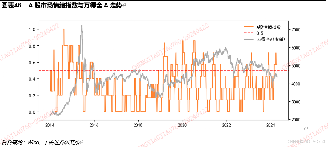 情绪指数代表择时信号中看多权益资产信号占比,对A股市场具有显著择时效果:指数的极端低位显著领先于市场底部,指数数值高于0.5,即有超过一半看多信号时市场平均表现较好。可以看到,A股市场情绪指数高于0.5时,市场行情较好。统计发现,2014年以来市场情绪指数的中数和均值均在0.3附近,市场情绪指数高于0.5、0.4、0.3的时间占比分别为19%、29%、40%。