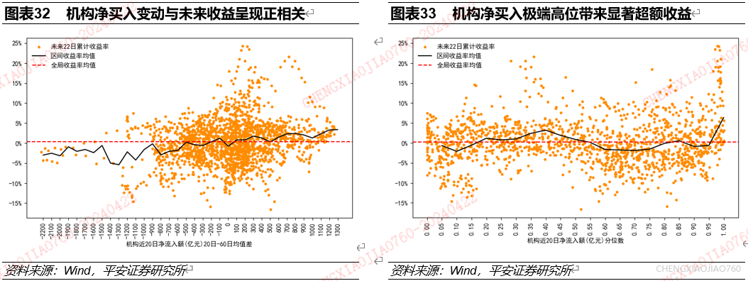 机构净买入的变动和极端位置都是资产择时的有效指标:机构净买入的变动与未来一个月资产收益水平正相关,机构净买入的极端高位对应未来一个月资产收益水平的提升。根据长短期均线法统计发现:近3个月的机构净买入变动与未来一个月万得全A累计收益率正相关。根据历史分位数法统计发现,机构净买入处于极端高位时,未来一个月市场具有显著超额收益。