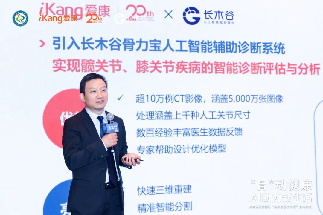 在这次活动中,长木谷®联合创始人、董事长兼CEO张逸凌分享了骨科领域人工智能完整解决方案,他表示:“长木谷®携手爱康集团共同将人工智能技术应用于骨科疾病管理中,从诊断、治疗到康复,实现全流程数字化完整解决方案,我们也将与更多医疗机构、骨骼临床中心展开合作,把数字化、智能化的AI技术,更好地落地到人群中,让更多的老百姓受益,让他们接受到更好的医疗服务。”
