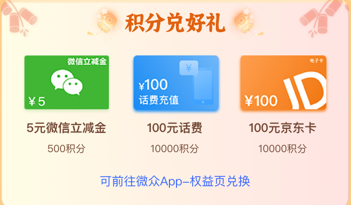 赚取的积分还可以兑换好礼,比如微信立减金、话费充值、京东卡等,直接把积分当钱花~