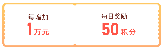 2024年4月29日16点到5月5日,新增购买活期+ (货币基金除外) 和指定理财子产品产品,每日24点持仓金额与2024年4月29日16点相比,总余额每新增1万元奖励50积分