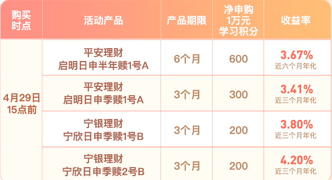 2024年4月29日16点-4月30日16点购买以下指定银行理财子公司产品并完成学习,享收益和积分奖励双重礼哦!