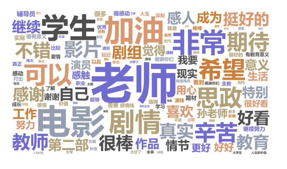 观众给剧组写了近5万条留言,除了“老师”“学生”等与电影主题高度相关的词,“思政”“加油”“希望”“期待”等也在留言中高频出现,绝大多数观众都表示了对这部影片的认可和感谢。