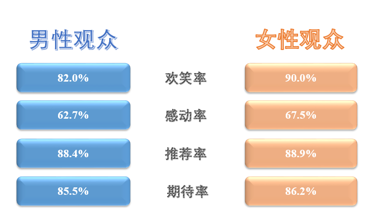 参与本次观影调研年龄最小和最大的观众分别为14岁和84岁,观众平均年龄25.3岁,29岁以下观众占比79.4%,男性观众占比37.6%,女性观众占比62.4%。女性观众从电影中获得了更多的欢乐和感动,同时男女观众对影片的推荐率和期待率基本一致,理智与情感得到很好的平衡。