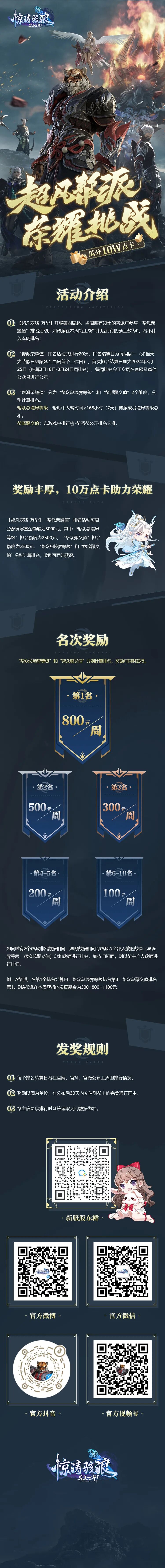 新服【超凡双线-万华】开服第四周起,将用帮派荣耀值分20次对上榜帮派进行排行。