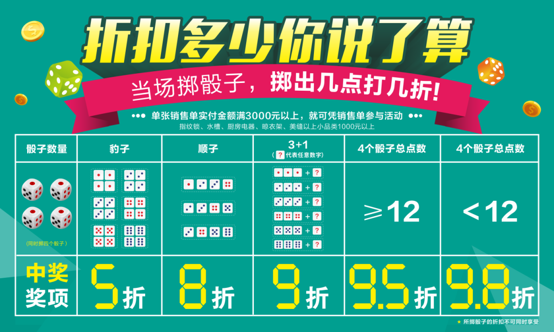 顾客同时将4个骰子扔向碗内 (骰子必须翻滚三圈以上视为有效),根据骰子所掷点数为顾客进行折扣计算。5 折、8 折、9 折...打几折你说了算!100%都有折扣!单笔最高可免 49999元!