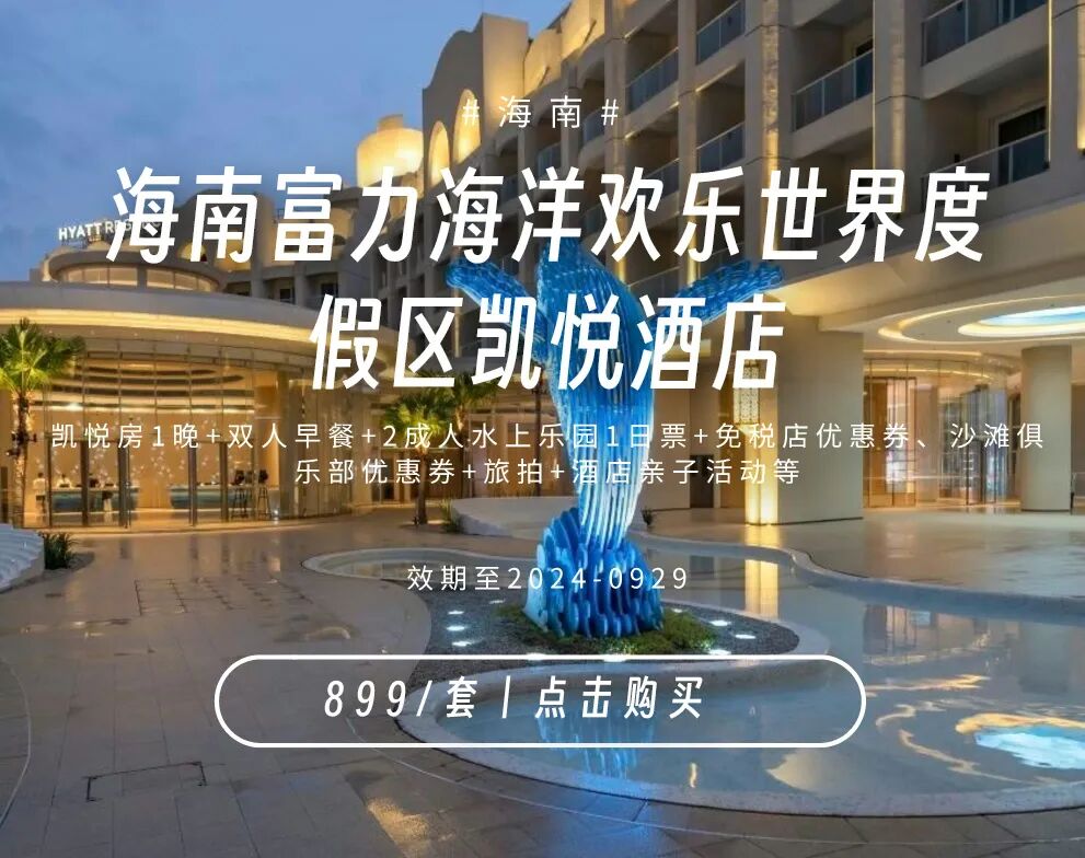 包含:凯悦房1晚+双人早餐+2成人水上乐园1日票+免税店优惠券、沙滩俱乐部优惠券+旅拍+酒店亲子活动等