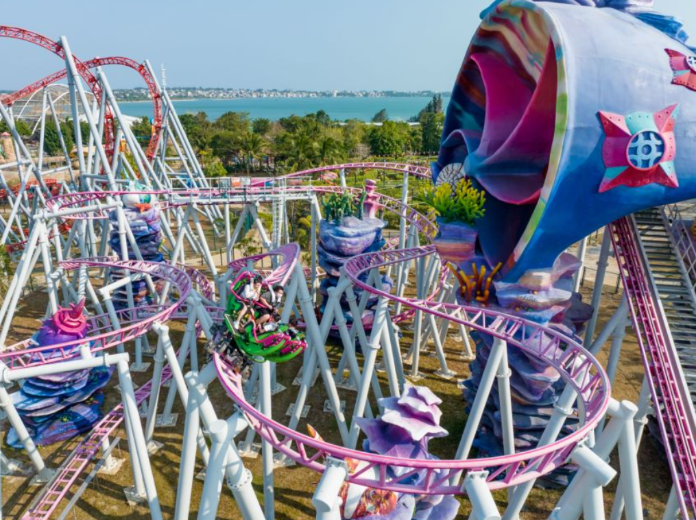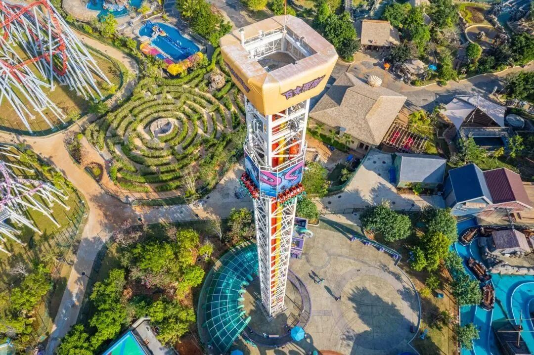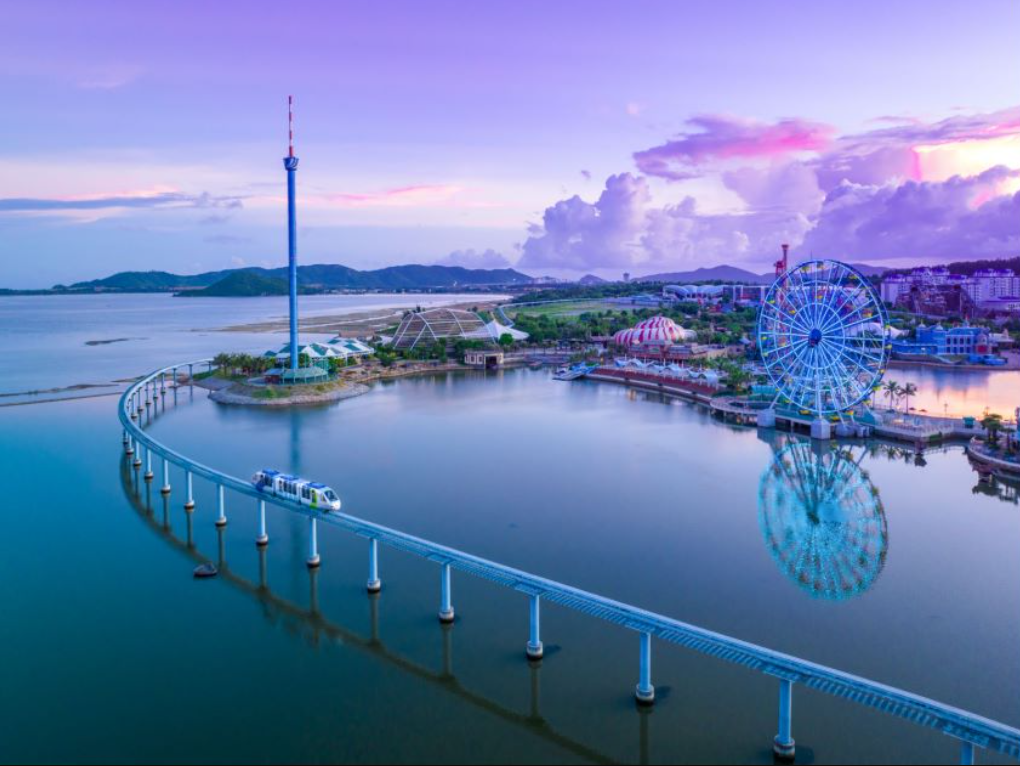 另一个吸睛点是列车旁高耸入云的瞰海塔,高123m,游客坐在360°旋转的全景座椅上,俯瞰整个“童话世界”的五彩缤纷!