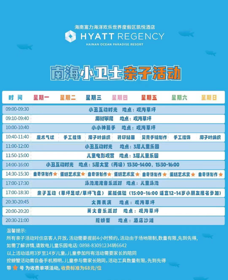 3~14岁小朋友还可以参加“南海小卫士”亲子活动,赶海捉蟹、DIY、泡泡派对等等等,活动很丰富~