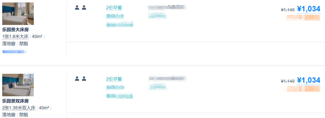 虽然套餐原本房型是凯悦房,但只要提前3天预约就可视房态升级为更高一档的乐园景大床/双床房,OTA自订要1034元/晚▼