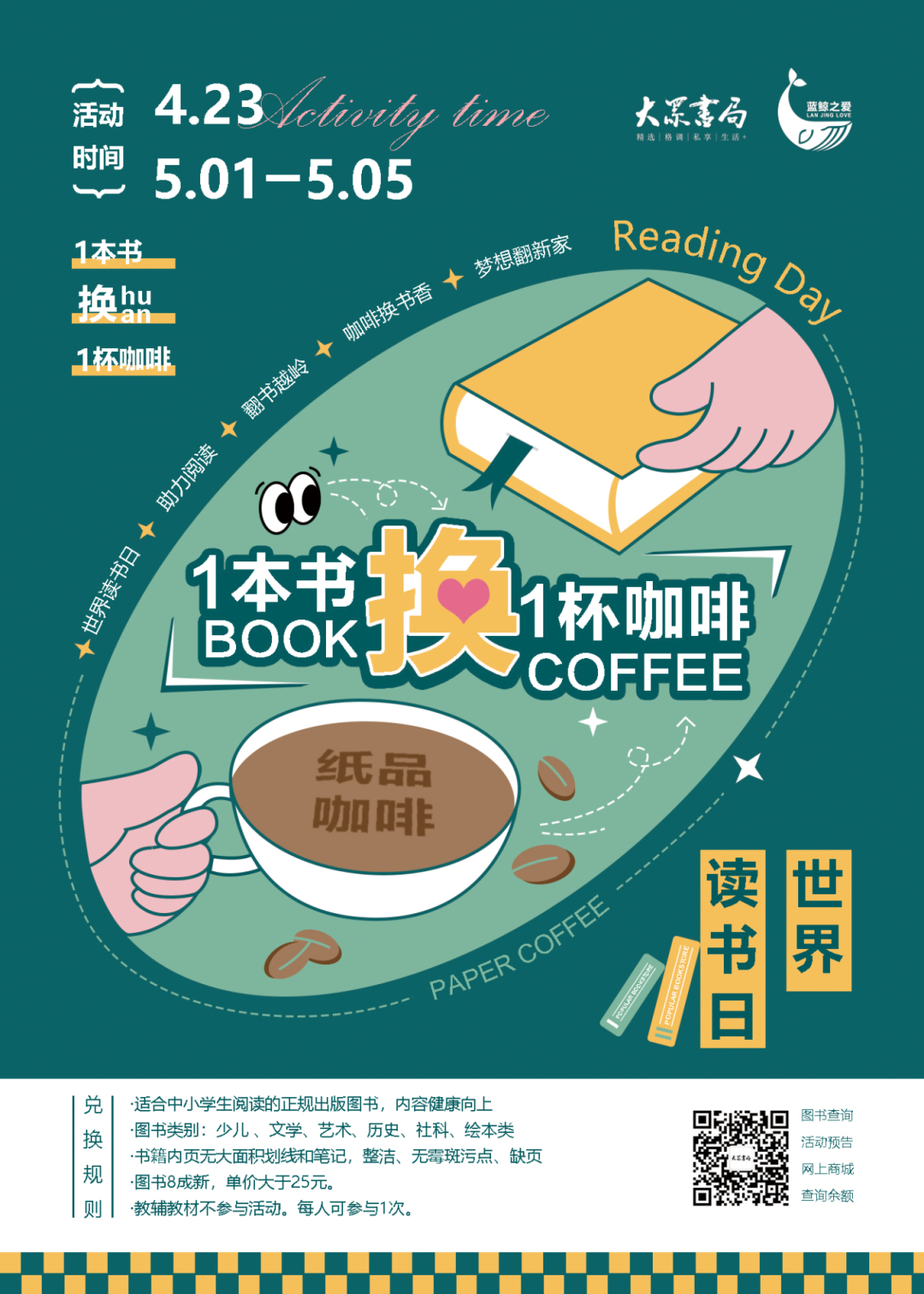 正值“423世界读书日”,大众书局特别推出“一本书换一杯咖啡”活动,让旧书找到新的知己。