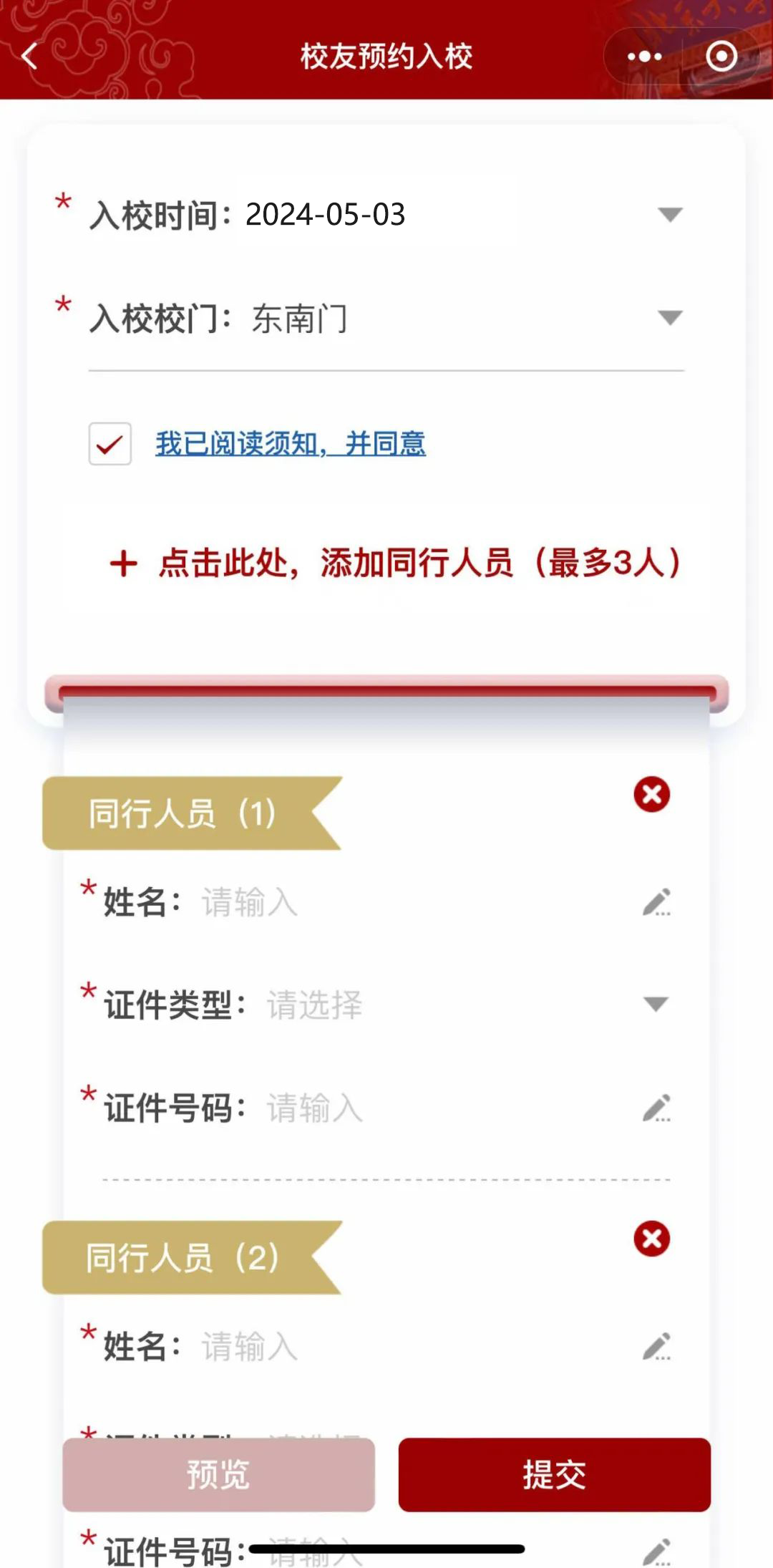 校友同行人员预约权限在4月30日提前开通,每日名额有限,请务必提前预约;每次预约需15分钟方可生效。
