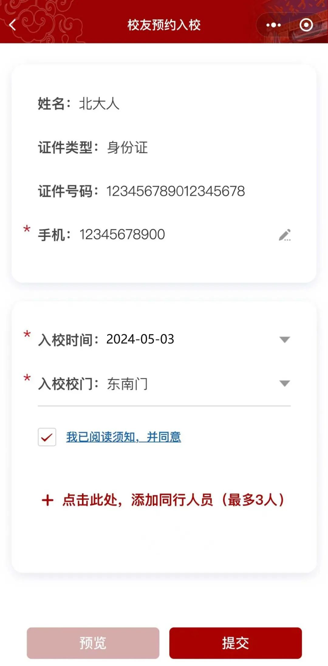 每位校友最多可预约三位同行人员;5月3日当天,校友本人须与同行人员一同入校。