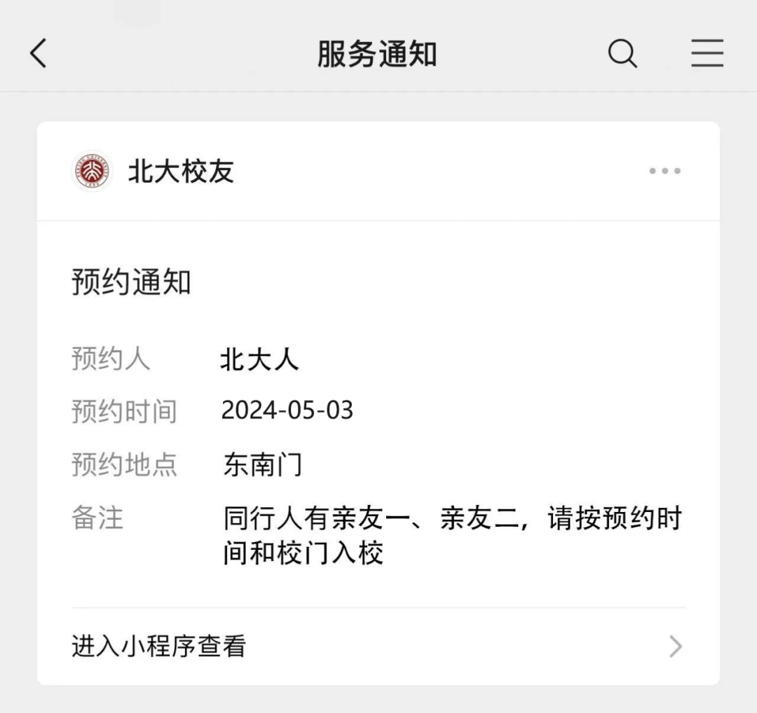 也可通过“北大校友”微信小程序预约系统中的