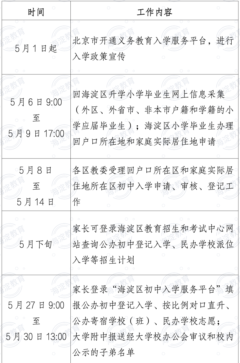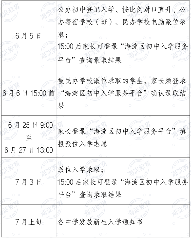 5月27日9:00至5月30日13:00,家长根据海淀区公布的公办初中登记入学、按比例对口直升、公办寄宿学校(班)、民办学校招生计划,登录“平台”,自愿选择填报1-10个志愿,也可放弃填报志愿。